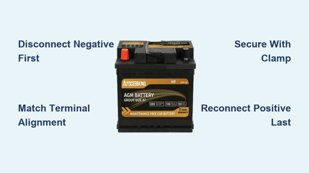 Reinstall the hold-down bracket with original hardware. Tighten until the battery can’t move when pushed firmly, but stop before the plastic case cracks (about 8-10 ft-lbs torque). Over-tightening is the #1 cause of premature battery failure—it damages internal plates.