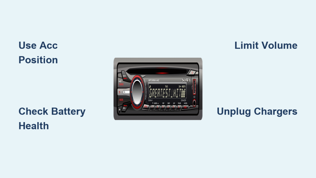 Your radio isn’t the real culprit—it’s the accessories silently killing your battery. Aftermarket amplifiers (drawing 25-30 amps) can reduce safe listening from 8 hours to under 60 minutes. Even seemingly harmless devices create dangerous drains: