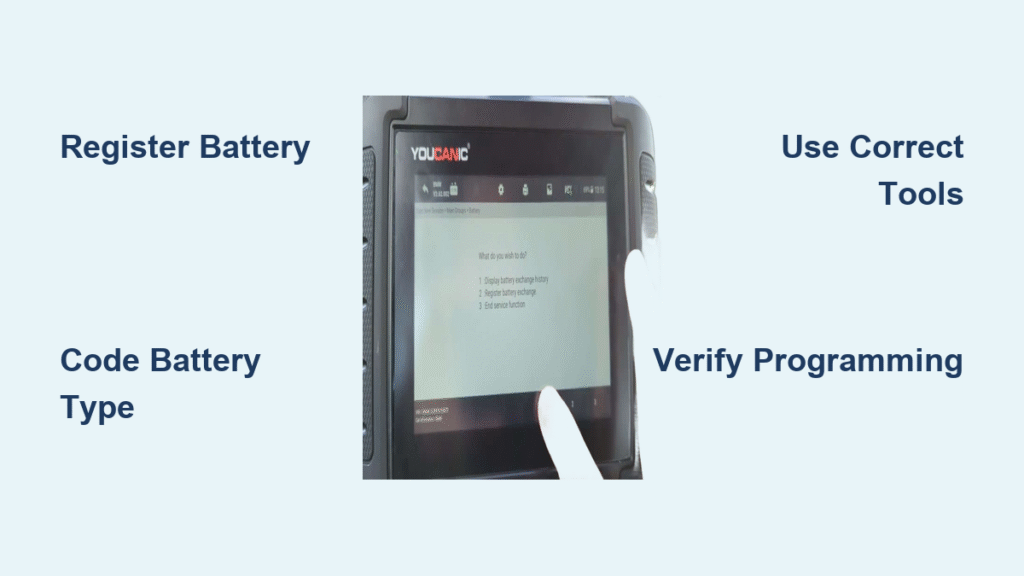 When to reprogram: Any new battery installation requires registration. Coding changes are needed only when switching types or capacities. Charging system fault codes or warning messages also indicate programming may be necessary.